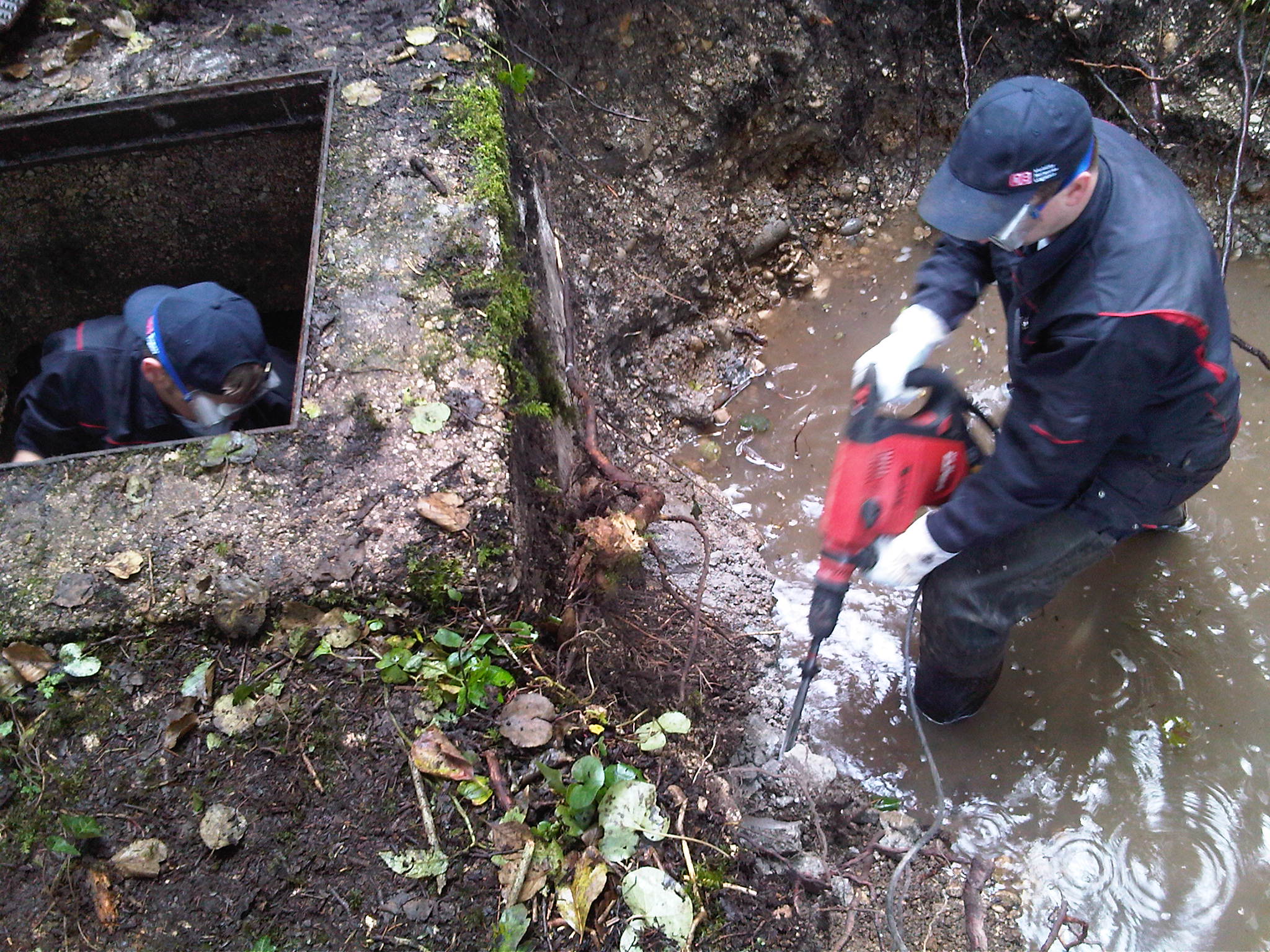 Auf Grund der Versiegelung von Fläche, die durch den Zeltbau bedingt war, musste als Auslgleich der Bach auf dem Gelände der Jugendbildungsstätte renaturiert werden. Das Foto zeigt zwei DB Manager, die mit schwerem Geschütz den begradigten Fluss aufbrechen.