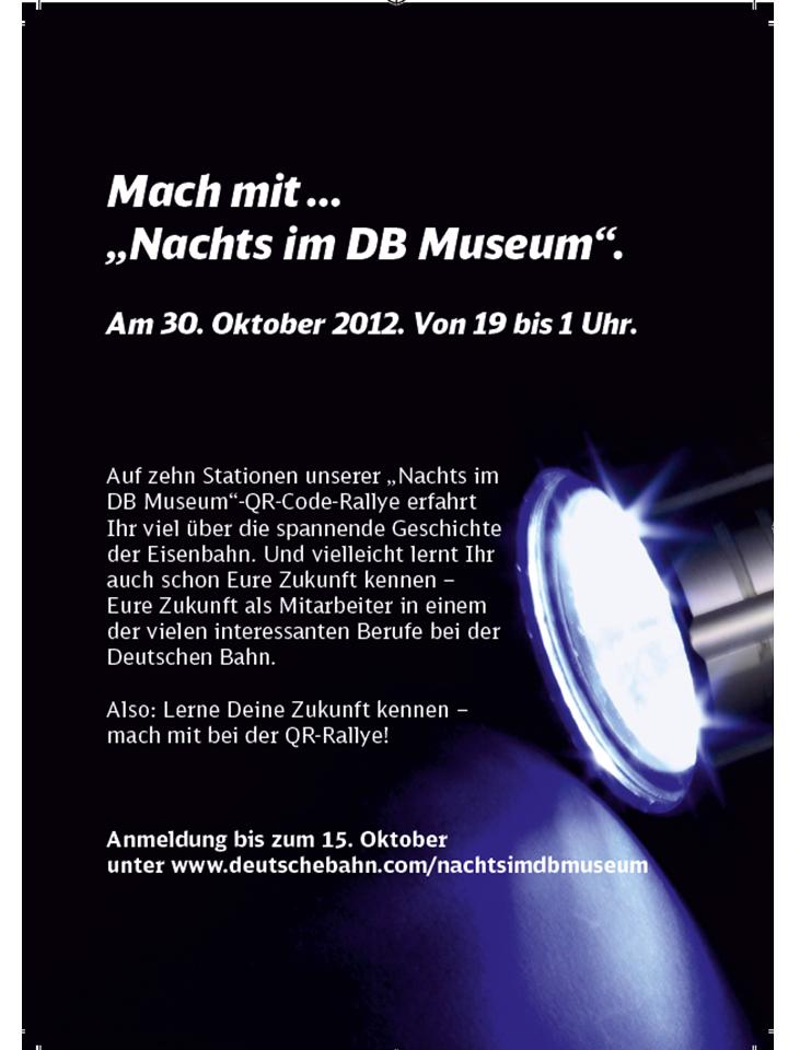 Unser neues Format „Nachts im DB Museum“ versucht die Brücke zwischen gestern und übermorgen zu schlagen. Die Verbindung von verstaubten Geschichten, die auf den ersten Blick nicht unbedingt sexy wirken, mit einem Rallye Format der neuen Generation, vermittelt vermeintlich trockenen Inhalte auf eine andere Weise.